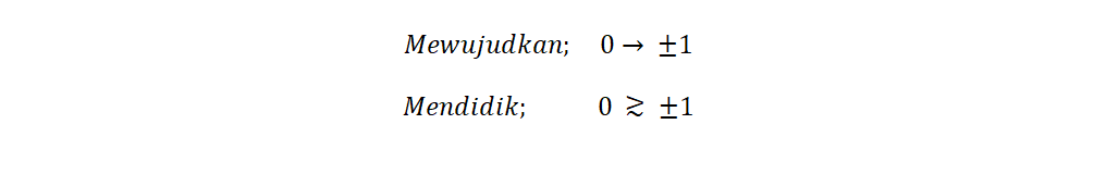 Menurut penulis, usaha ‘mewujudkan’ adalah perbuatan yang menjadikan perkara yang tidak ada kepada sesuatu yang bernilai. Daripada persamaan nombor di atas, simbol ‘anak panah’ menggambarkan keadaan perubahan daripada tidak bernilai kepada satu nilai. Tak kira samada bertambah (positif) ataupun berkurang (negatif) daripada keadaan asalnya. Mantik disebalik usaha mewujudkan ‘satu nilai’ pada diri individu adalah bersifat paksaan kerana umum mengetahui hikmah kejadian manusia bukan ‘sifar’. Potensi individu ada nilainya dan nilai ini sebenarnya ‘menghampiri sifar’ bukannya ‘sifar’. Oleh sebab itulah, memandangkang usaha ‘mendidik’ itu adalah proses belajar dan mengajar ilmu, dan ilmu pula tidak bermula daripada ‘sifar’. Maka, ‘mendidik’ adalah kata terbitan yang tepat untuk proses menyemai ‘ilmu’. Jika kita perhatikan persamaan matematik di atas, mendidik adalah perkara yang membentuk nilai. Daripada keadaan ‘menghampiri sifar’, kepada keadaan yang bukan ‘menghampiri sifar’.