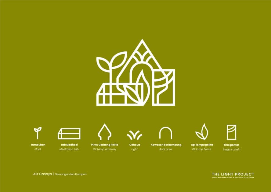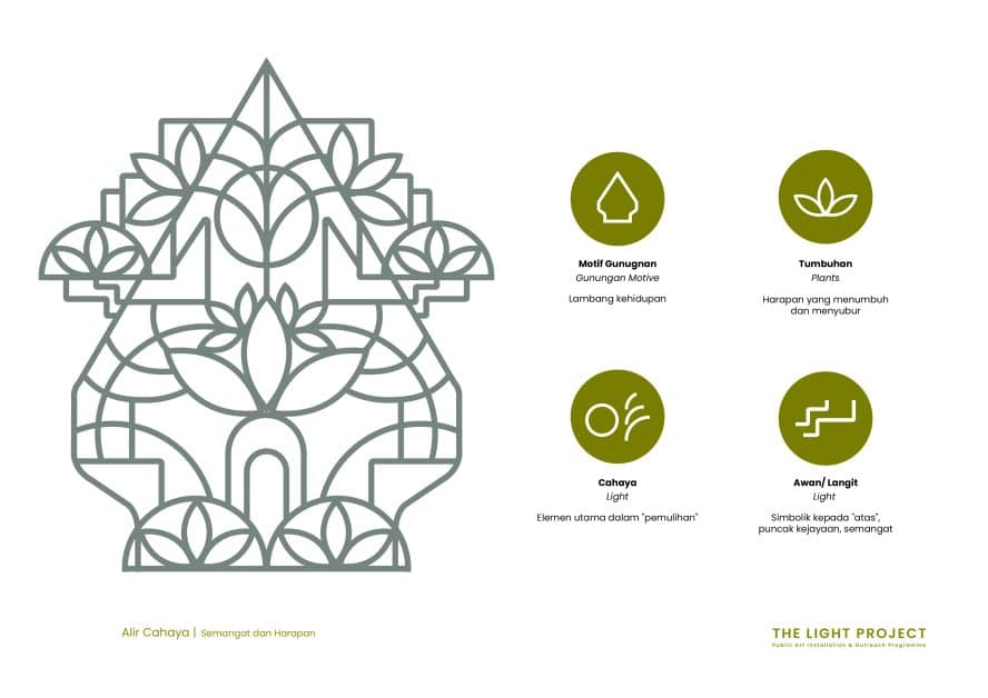 Seperti dijelaskan oleh Aisyah lagi, instalasi karya ini akan merespon ruang pintu masuk utama dengan menggunakan kaedah susunan cahaya pelita. Karya ini merupakan sebuah cerminan tradisi masyarakat dalam menyambut perayaan aidilfitri, deepavali serta tahun baru cina dan lain-lain. Aliran cahaya ini simbolik kepada semangat dengan mengangkat imej “gunungan” sebagai lambang kehidupan, dimana corak imej karya ini akan memiliki unsur udara, angin, api dan tanah. Boleh diertikan juga sebagai kehidupan yang tiada habis atau disebut “patah tumbuh hilang berganti”.