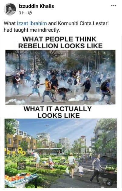 “Bila dah ada makanan dan komuniti, rasa macam ‘malas’ sudah nak fikir sangat-sangat pasal isu-isu yang luar daripada kawalan. Lagi-lagi dah pernah rasa korupsi dari semua parti (barisan pemerintah) yang pernah memerintah walaupun peringkat daerah dan negeri. Huhu. Bila kurang berkomuniti, mudah timbul pergaduhan bila kita tak bersahabat dan berkenalan betul-betul dengan orang lain aliran. Kalau berkomuniti, pasti lebih berhati-hati. Belajar hasilkan makanan sendiri dan bina komuniti linkungan dekat. Lebih mandiri dan lestari. Insha Allah.”