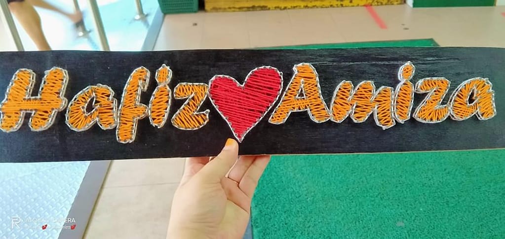 Balik sahaja Johor, aku try buat balik dengan kira-kira masa dan hari yang perlu aku luangkan untuk satu artwork. Aku eksperimen semua material, aku pilih konsep design macam mana perlu aku buat. Dan pernah terjual hampir 50pcs papan tanda nama couple. Lepas tu aku stop balik sebab aku tak plan pun untuk serius. Lagipun aku masih buat kerja penulisan dan penerbitan lain. Macam tu lah.