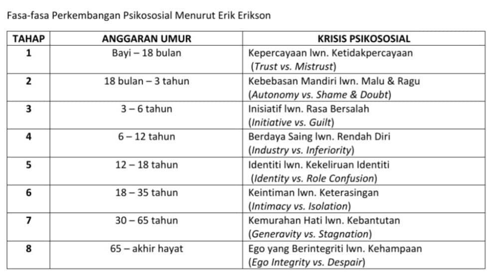 - Tahap-tahap Perkembangan Psikososial Erik Erikson.